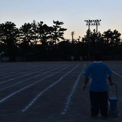 暗くなるまでグラウンドに線を引き、振り返るK先生。