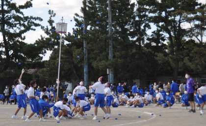 ほのぼのとした雰囲気ですが、「色別対抗」の「玉入れ」です。