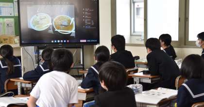 電子黒板に写されたおいしそうなラーメンの画像を見ながら、M先生の話を聞いています。