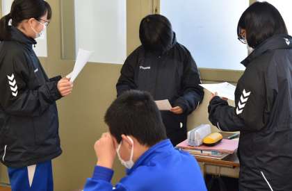 筆者の考えを要約し、書いた文章を周りの生徒同士で読み合っています。