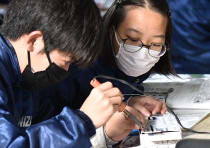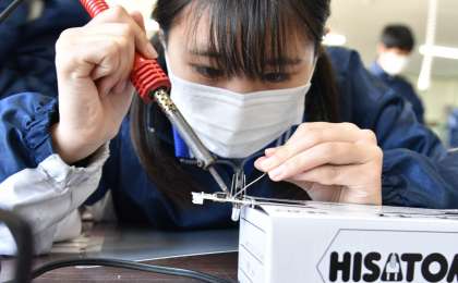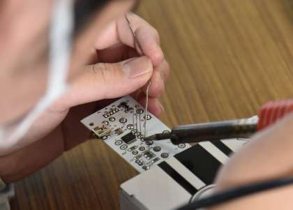 はんだごてを使って、基板に細かな部品を取り付けています。