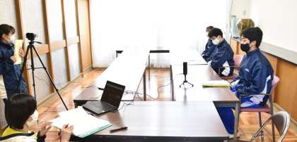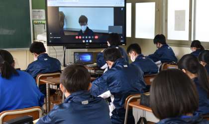 教室では、電子黒板と資料を見ながら参加しています。(画像は2F)
