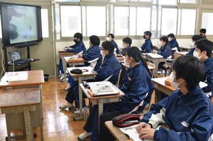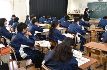 電子黒板で教材動画を視聴したり、K先生の説明を聞いたりしながら、学習プリントにまとめていきます。