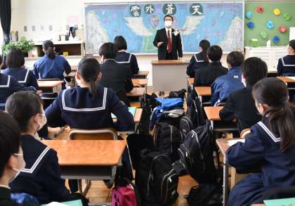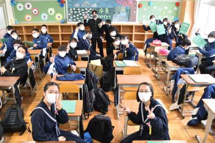 カメラを見つけてアピールする生徒たち、そして教室の前から全体を撮ってみました。
