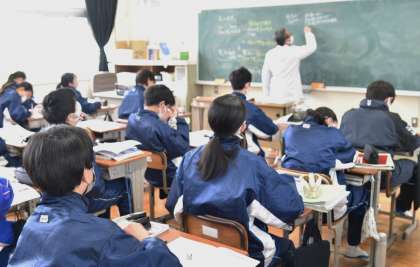 K先生から説明を聞いて、一生懸命に板書を書き写しています。
