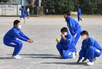 守備側は、打たれたボールをキャッチすると、みんなで集まって「アウト〜」と声を出しています。(画像2枚目)