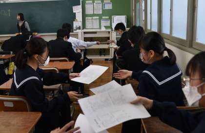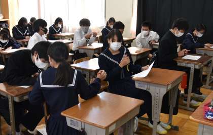こちらも「文法」の学習で、学習プリントを隣の生徒と交換して○付けをしています。