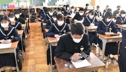 問題用紙・解答用紙を受け取り、緊張の面持ちでテスト開始のチャイムを待っています。