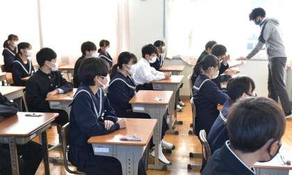 1Fの生徒たちが、監督のW先生から用紙を受け取っています。