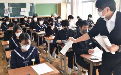 S先生からテスト用紙を受け取っています。