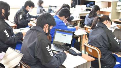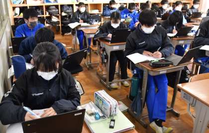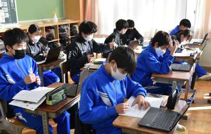 T先生の説明を聞きながら、タブレット端末を見たりノートにまとめたりしています。