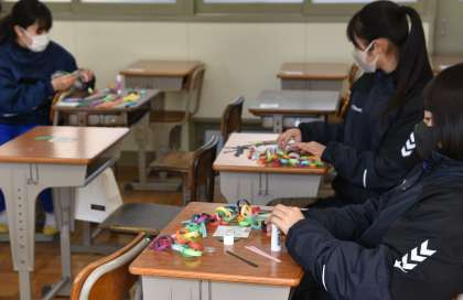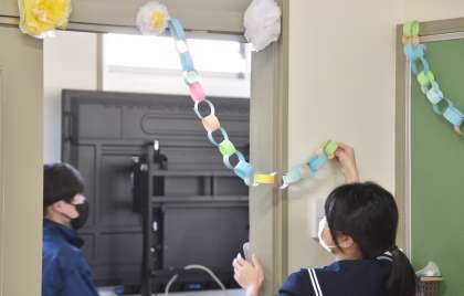 手作りの花や輪を飾る生徒たちです。
