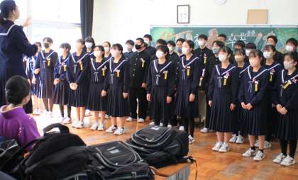 A組はS先生の話を聞き、合唱コンクールで歌った「群青」を披露しました。
