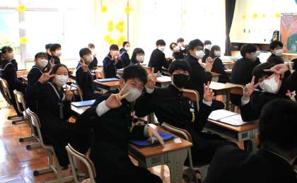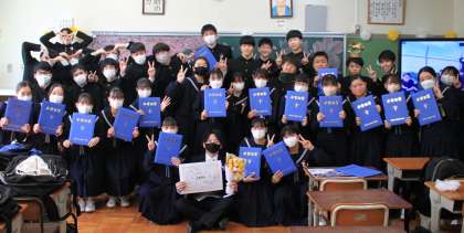 画像上で、担任のK先生が右手に持っているのは、みんなからの寄せ書きです。