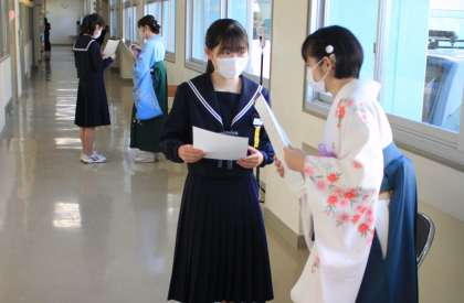 教室内は笑顔であふれていますが、廊下で受け取るときは、いたってマジメな表情です。