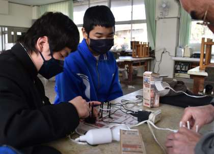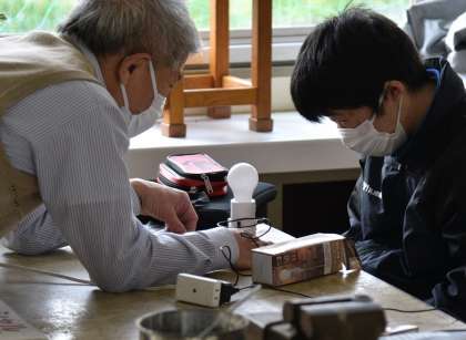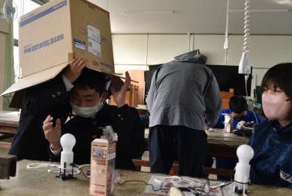 暗くなると光る仕組みなので、実際に光るかどうか、段ボール箱に入れて(自ら入って)確かめています。