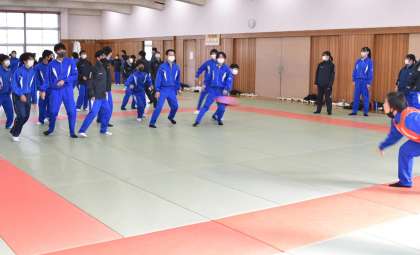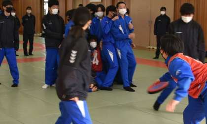 柔道場で、男子vs女子の「ドッジビー」をしています。