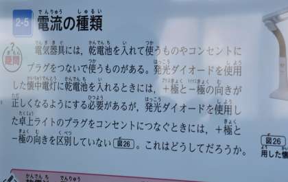 T先生が、豆電球をつなげたプラグをコンセントに挿そうとしています。
