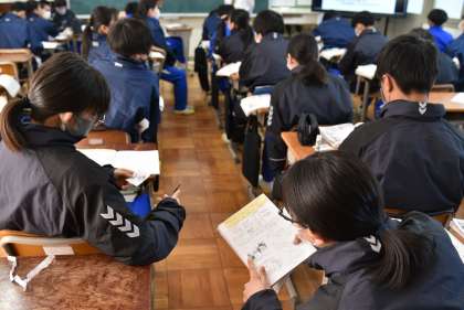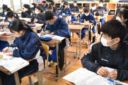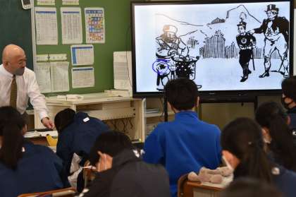 電子黒板に「火中の栗」という風刺画が示され、I先生から「この絵の意味を考えてみよう」と言われました。