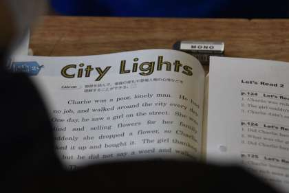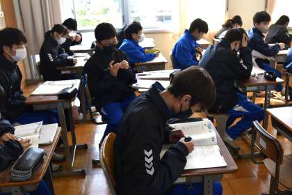「Let's Read2」の学習で、教科書の本文を読んで、ワークシートの問題を解いています。