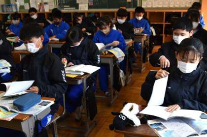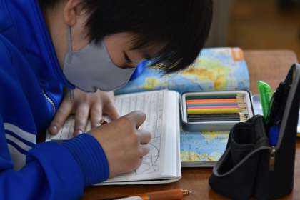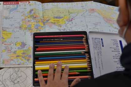 色鉛筆を手に、地図帳を見ながら課題に取り組んでいます。