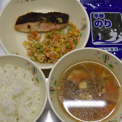 献立表にある「作ってみよう」のとおり、ご飯と一緒にのりで巻いて食べました。