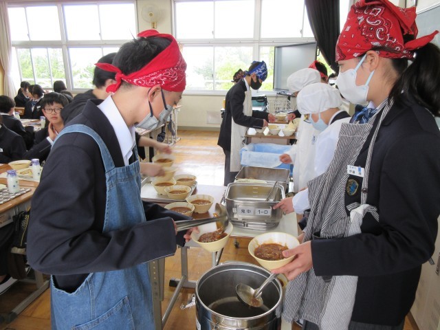 エプロンを身につけ、協力して配膳をします。