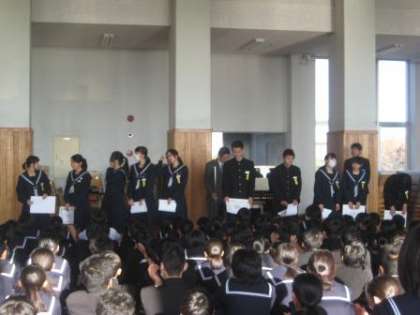 終業式を行いました。体育館工事のため、今年は体操場で行いました。2学期の締めくくりの式です。2学期を振り返れば、体育祭や文化祭、合唱コンクールなどクラスのまとまりが強くなったり、成長したりできる行事がたくさんあったと思います。冬休みには、大晦日やお正月など日本の伝統行事に触れる機会がたくさんあります。元気な姿でまた始業式に会うのを待っています。(蒼)