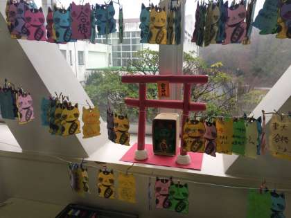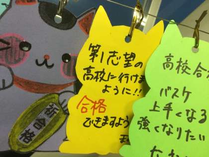 常滑中のパワースポット「常中神社」を紹介します。合格招福に効果がある両手を挙げた緑色の招き猫を中心に,たくさんの生徒が絵馬を書きました。毎日頑張っているみんなの姿は頼もしい。みんななら大丈夫!(一)