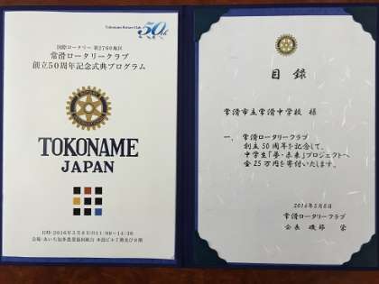 常滑ロータリークラブが50周年を迎えられました。おめでとうございます。そして、50周年記念事業の1つに、「中学生〈夢・未来〉プロジェクト」があります。これは、未来の日本を担う子どもたちが、夢を描きその実現に向けて逞しく成長していくために、市内4中学校に25万円をいただき、それぞれ講演会を計画するものです。