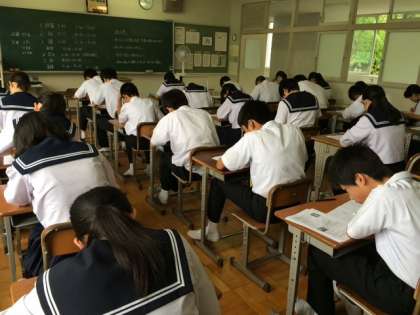 昨日から,1学期期末テストが行われています。今年度から,音楽,美術の教科でもテストを実施するようになり,生徒は9教科全てのテストを受けます。テスト中,教室で聞こえるのは鉛筆で書く音…。みんな必死に取り組んでます。残るは明日の3教科。がんばれ!常中生!!(一)