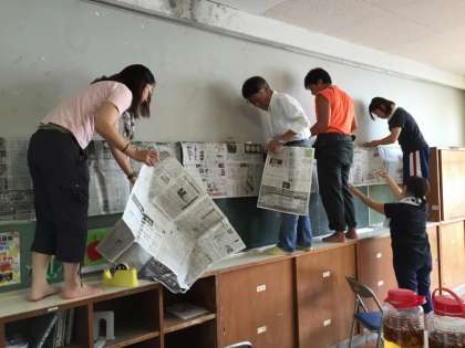 二学期に向け、午後職員作業を行いました。多目的室・G組のペンキ塗り、倉庫の整頓、飛散防止フィルム貼りなどです。ベテランのテクニックと若者のパワーが生かされ、チームワークを感じる作業内容でした。