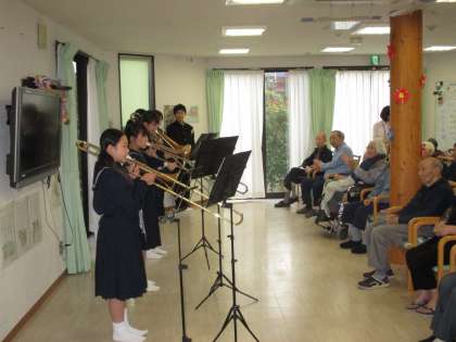 去る11月19日の土曜日、サンハートライフ常滑にて、吹奏楽部による演奏会が行われました。部屋の関係上、みんなでそろってというわけにはいきませんでしたが、各楽器の良さを十分に披露することができました。