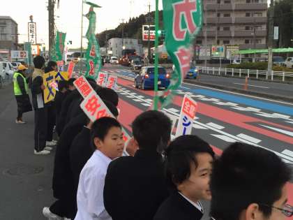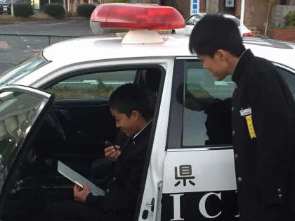 パトロールカーのマイクを使い、代表者が安全運転を呼びかけました。