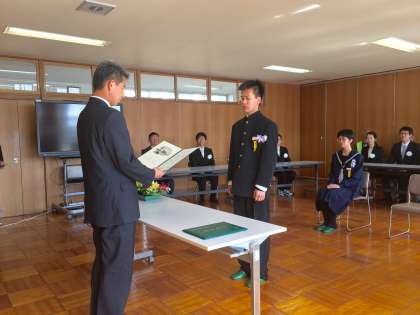 3月8日 卒業式 Part2 公開日 2017/03/08 更新日 2017/03/08 校長より 3月3日の卒業式に出席できなかった生徒のために、卒業式を会議室で行いました。学年主任、担任から、熱いメッセージが伝えられました。 いいね(0)