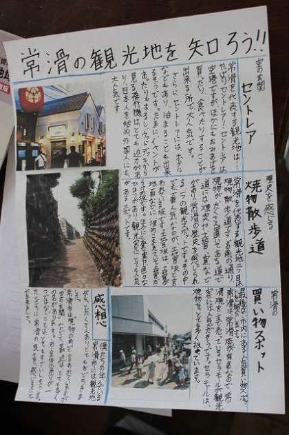 常滑調べ 公開日 2017/06/14 更新日 2017/06/14 お知らせ(生徒会活動、委員会、部活動など) 一年生は総合の時間を使って常滑について調べています。 もう少しで発表があるため、生徒たちは一生懸命に常滑について調べ、まとめていました。 常滑の観光ランキング、常滑の有名店、特産物など常滑のいいところについてたくさん調べていました。 各自工夫してまとめてあり、色とりどりで発表を聞けるのが楽しみです。(に) いいね(0)