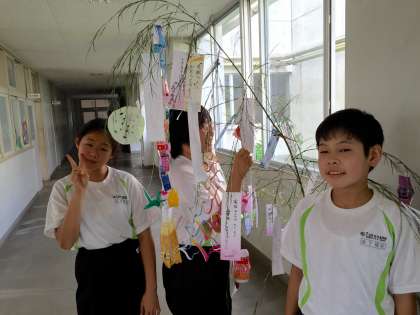 今日は七夕です。G組では、笹の葉に願い事を書いた短冊を飾りました。 (私も参加しました(^^))