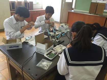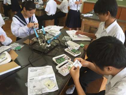 2年生の技術科では、発電実験ラジオを作っています。今日は、はんだ付けの練習をしました。