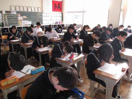 12月もそろそろ半ばを迎えました。3年生の各教室では、生徒一人一人が真剣に進路と向かい合っています。今週の懇談会では、どこの私立高校を受験するかについての話合いが大詰めを迎えるのではないでしょうか。どういう進路を選択するにしても、真剣に考えぬいて、結論を出すようにしたいですね。(た)