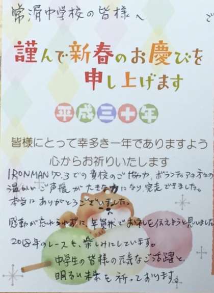 1月11日 感謝の年賀状 公開日 2018/01/11 更新日 2018/01/11 校長より 大変うれししい感謝の年賀状が届きました。 6月に行われたアイアンマンレースに参加された方からです。 アイアンマンレースのボランティアでは、みんなの応援が力になり、選手の方々からいっぱい元気をもらいました。感動ボランティアでした。 選手の皆さん、今年も頑張ってください。 いいね(0)