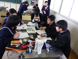 2月26日 1年B組研究授業 公開日 2018/02/26 更新日 2018/02/26 お知らせ(生徒会活動、委員会、部活動など) 1年B組で理科の研究授業が行われました。 岩石の色や組織の大きさを見比べて、6種類の岩石に分けていきます。 虫眼鏡や双眼実体顕微鏡を使って、班の友達と相談しながら考えていましたが、なかなか難しかったようです。 マグマが冷えて固まった火山岩でもよく観察してみるといろいろと違いがあることを確かめることができました。 (い) いいね(0)