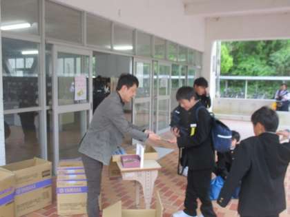 今朝、昇降口で1年生にアルトリコーダーの販売を行いました。