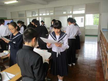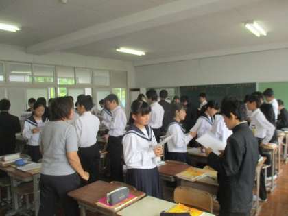 4/27 すらすら English 公開日 2018/04/27 更新日 2018/04/27 校長より 2年D組の英語です。 間瀬先生は授業の導入の場面で「すらすら English」を行っていました。 ペアで簡単な会話文の受け答えをします。 時間を区切り、ペアをどんどん変えていきます。 英語に慣れる。 会話に慣れる。 コミュニケーションに慣れる。 短い活動ですが、いろいろな意味が含まれている活動です。 いいね(0)