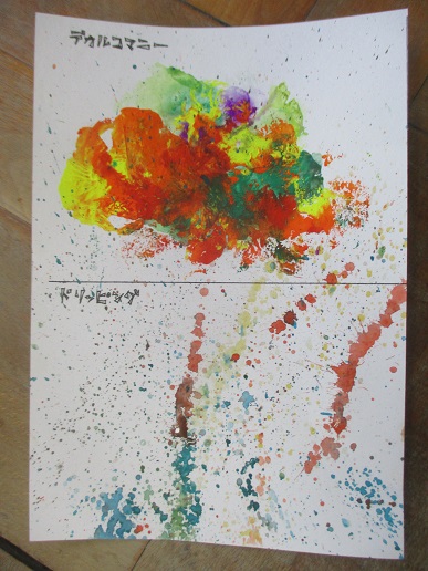 絵具を多めの水でとき、筆に染み込ませて、筆をたたくようにして画面に飛ばす。