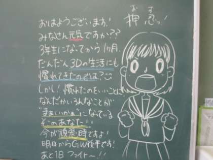 5/2 黒板に・・・ 公開日 2018/05/02 更新日 2018/05/02 校長より 3年D組の朝の黒板です。 新美先生の一言が書いてありました。 子どもたちの様子を見て、感じたことや励ましが書いてあります。 よく見てくれていますね。 細かな配慮に感謝します! いいね(0)
