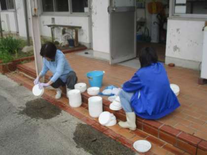 学校パートさんが、式で使った鉢植えの受け皿をきれいにしていました。