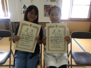 図画の部と習字の部で、市長賞に3年生の女の子の作品が選ばれ、市長さんから表彰していただきました。