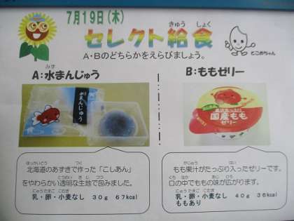 5/24 あなたはどっち? 公開日 2018/05/24 更新日 2018/05/24 校長より 7月19日はセレクト給食です。 今、子どもたちはどちらにするか選んでいます。 水まんじゅうかモモゼリーか? う〜ん、どっちも捨てがたい。 いいね(0)