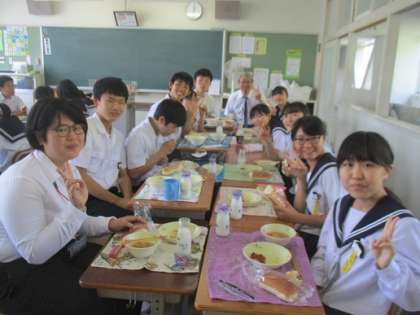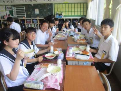 6/4 2E給食訪問 公開日 2018/06/04 更新日 2018/06/04 校長より 2年E組の給食訪問です。 子どもたちはカメラを向けるといい笑顔で応えてくれます。 担任の赤井先生も牛乳だけを持って、さわやかな笑顔を作ります。 実習生の澤田先生も子どもたちと一緒に食べています。 あれ? 澤田先生の奥に見知らぬおじさんが・・・。(写真下) 澤田先生の大学の先生が実習の様子を見に来てくれ、ついでに写真にもちゃっかり入ってくれました。 いいね(0)
