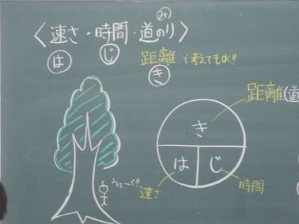 6/14 木下の激しいじいさん 公開日 2018/06/14 更新日 2018/06/14 校長より 1年E組の数学です。 皆が悩む「速さ」と「時間」と「距離」の学習です。 3つの関係がぐちゃぐちゃになりやすいので、いろいろな覚え方があります。 ここでは「木下の激しいじいさん」でした。 山田先生は絵まで描いてくれました。 「ウェ〜イ」がいいですね! どんな覚え方でもいいですが、覚えてくれればいいです。 小学校ではどのように覚えたかな? いいね(0)